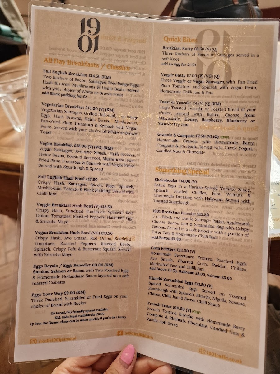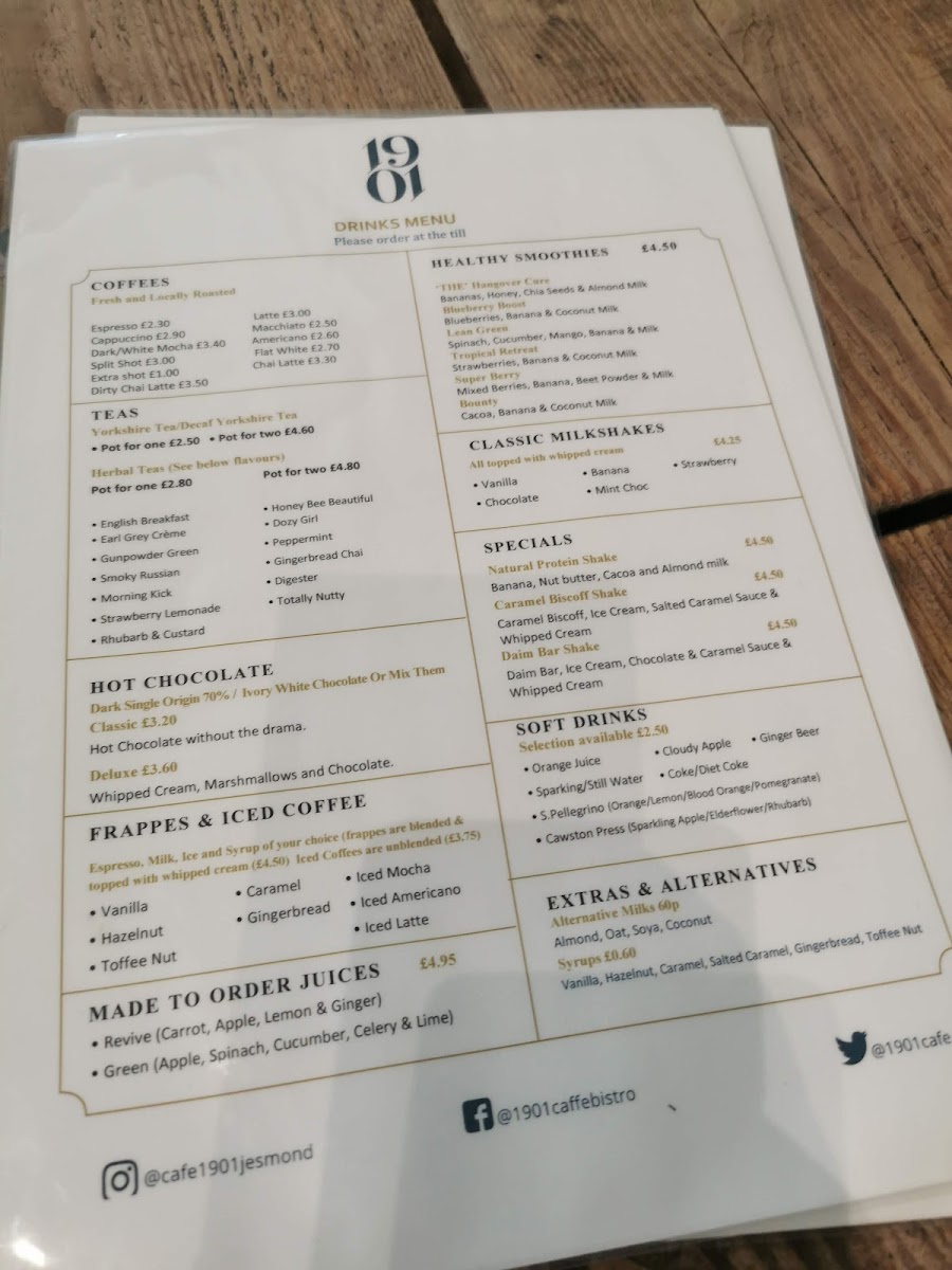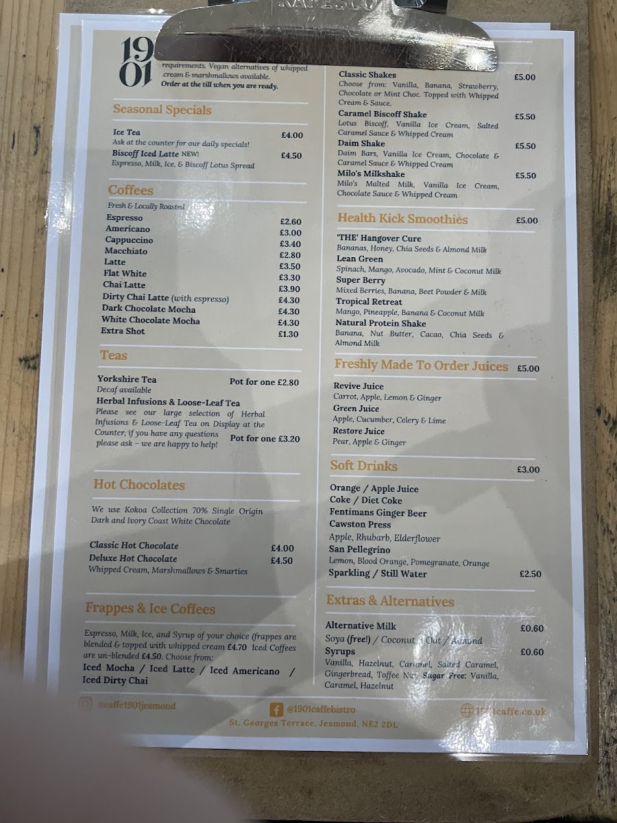 Welcome to Caffe 1901 Bistro, nestled in the heart of Jesmond. This cozy cafe is a culinary gem, offering a delightful array of dishes that cater to every palate. Start your day with a mouthwatering Full English Breakfast or dive into the vibrant Halloumi & Orange Salad for a lighter option. The menu also features an impressive selection of health kick smoothies like the Hangover Cure and Tropical Retreat, perfect for a refreshing boost.